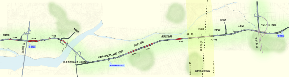 時代大道南延項目位于杭州市蕭山區,起點為聞戴公路與繞城公路交叉口以南約60米處沿線往南跨過浦陽江,經過義橋鎮、戴村鎮,終點至聞戴公路與規劃城市中環線交叉處以南約1公里處。項目采用高架+地面道路形式,主線高架全長約11.2公里,地面道路建設里程約3.87公里。
