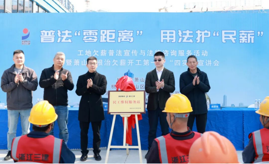“普法先行,杜絕欠薪,讓農民工勞有所得!”近日,普法“零距離”用法護“民薪”|工地欠薪普法宣傳與法律咨詢服務活動在浦南未來學校項目部開展。臨浦鎮黨委委員、副鎮長徐瑋韜,蕭山區教育局、浙江省三建建設集團、蕭山城區建設、鎮勞動保障站相關負責人,項目建筑工人等參加。