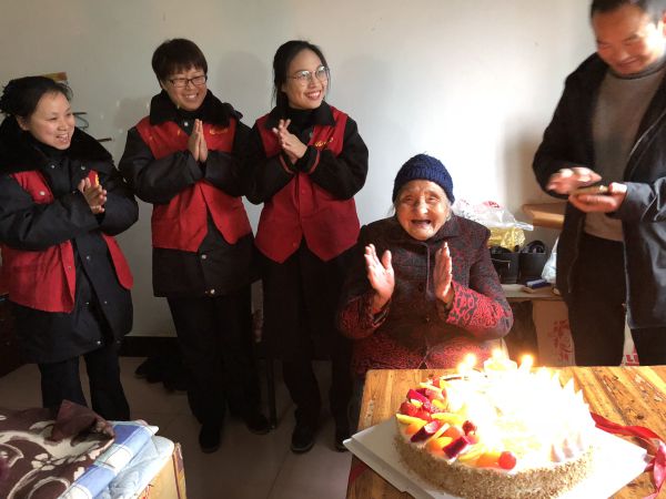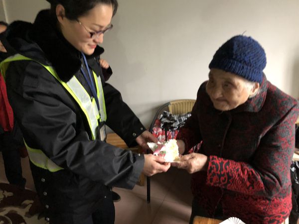 12月15日上午,公路開發公司下屬浦陽收費站團員青年來到結對敬老院為百歲老人慶祝生日,為她們帶去了蛋糕、水果以及生日的祝福。